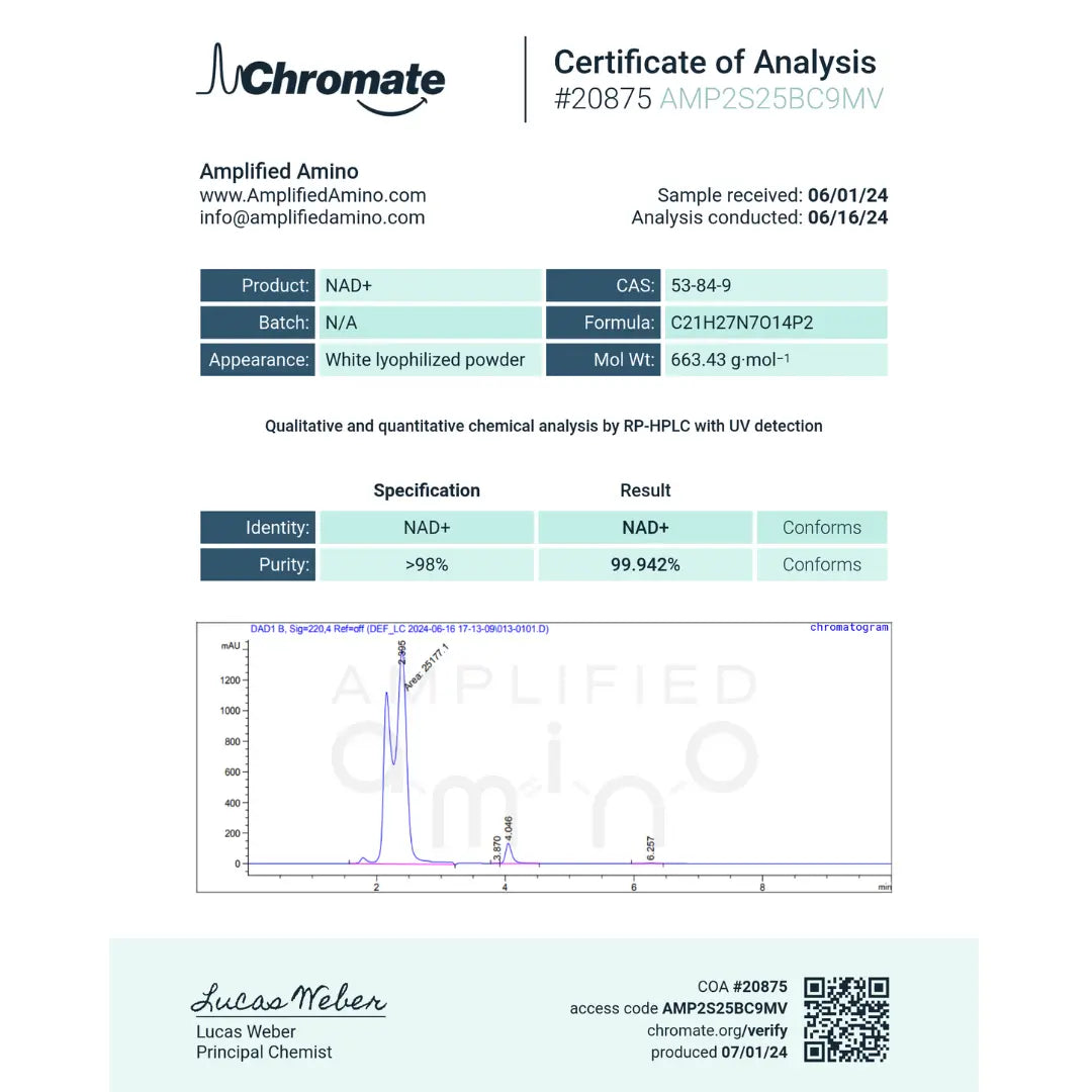 Purity and concentration testing verifies that the ingredient is present in the correct amount, with a purity of 98% or higher to meet stringent quality standards.